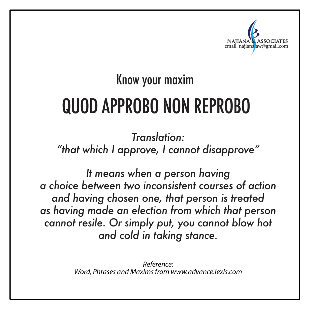 The doctrine of Approbate and Reprobate comes from this maxim. It means when a person having a choice between two inconsistent courses of action and having chosen one, that person is treated as having made an election from which that person cannot resile. Or simply put, you cannot blow hot and cold in taking stance.Reference:Word, Phrases and Maxims from www.advance.lexis.com